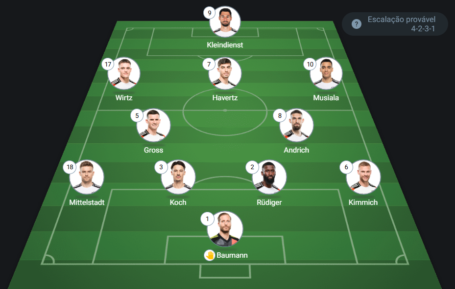 Provável escalação da Alemanha: Baumann, Mittelstadt, Koch, Rüdiger e Kimmich; Gross, Andrich, Wirtz, Kai Havertz e Musiala; Kleindienst. Técnico: Julian Nagelsmann.
