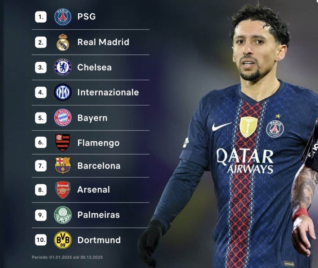 O líder do ranking é o atual campeão da Liga dos Campeões e atual campeão do Mundial de clubes, PSG, seguido de Real Madrid e Chelsea no top 3. O Flamengo aparece em sexto lugar, enquanto o Palmeiras aparece em nono lugar.