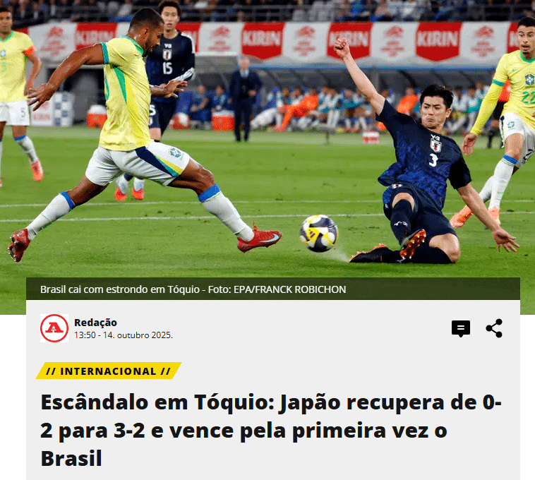Jornal argentino, o “Olé” foi mais incisivo. Além de reforçar o vacilo da Seleção meses antes da Copa de 2026, o periódico disse que o Japão “fez a festa” e deu uma “surra” no time de Carlo Ancelotti.