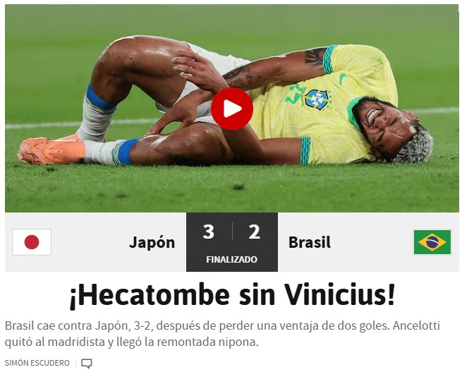 O grande foco foi a reviravolta “relâmpago” do Japão, que voltou muito bem do segundo tempo quando estava perdendo por 2 a 0 e, em 19 minutos, fez três gols. Tradicional jornal da Espanha, o “Diario AS” enfatizou que o Brasil sofreu hetacombe, ou seja, uma espécie de “catástrofe” sem Vini Jr. O atacante foi titular e substituído no intervalo.