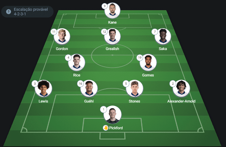 Provável escalação de Inglaterra: Pickford, Lewis, Guéhi, Stones e Alexander-Arnold; Rice, Angel Gomes, Gordon, Grealish e Saka; Kane. Técnico: Lee Carsley.