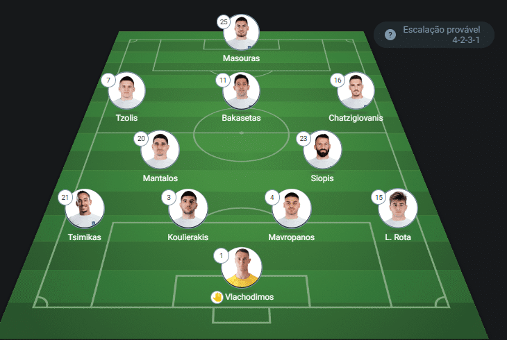 - Provável escalação de Grécia: Vlachodimos, Tsimikas, Koulierakis, Mavropanos e Lazaros Rota; Mantalos, Slopis, Tzolis, Bakasetas e Chatzigiovanis; Masouras