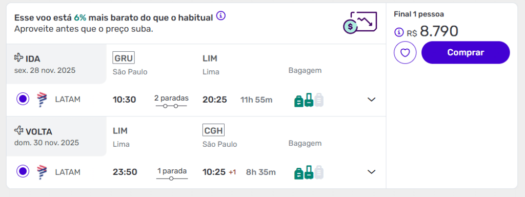 São Paulo (Viracopos) x Lima x São Paulo (Viracopos) — Bagagem de mão incluída