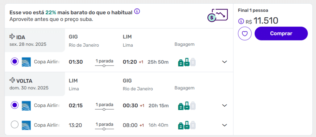 Rio de Janeiro (Galeão) x Lima x Rio de Janeiro (Galeão) — Bagagem de mão incluída