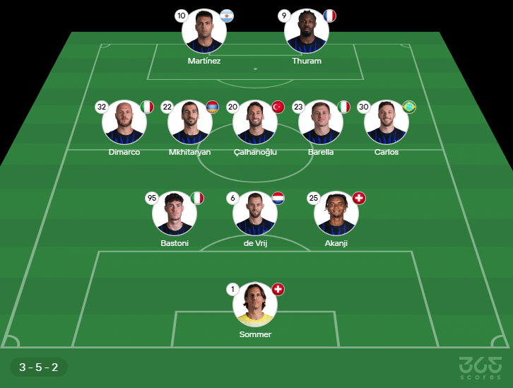Provável escalação da Inter de Milão: Sommer, Akanji, De Vrij, Bastoni; Carlos Augusto, Barella, Çalhanoglu, Mkhitaryan, Dimarco; Thuram, Martínez. Técnico: Cristian Chivu