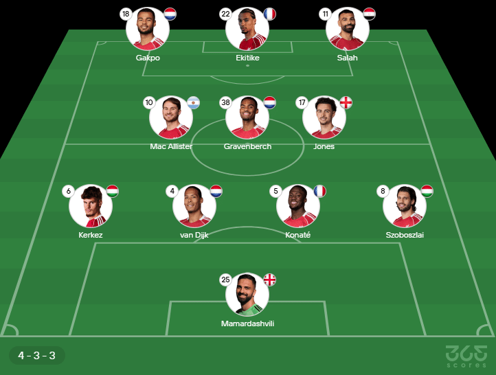 Provável escalação do Liverpool: Mamardashvili; Szobozslai, Konaté, Van Dijk, Kerkez; Gravenverch, Jones, Mac Allister; Salah, Gakpo, Ekitike. Técnico: Arne Slot