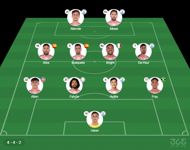 - Provável escalação do Real Madrid: Inter Miami: Ustari; Allen; Falcón, Avilés e Fray; Alba, Busquets, Bright e De Paul; Allende e Messi