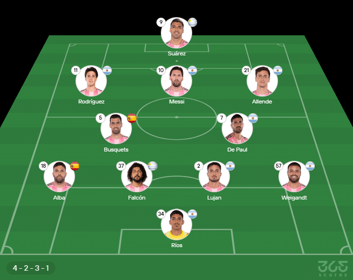 Escalação do Inter Miami: Ríos, Jordi Alba, Falcón, Lujan e Weigandt; Sergio Busquets, De Paul, Baltasar Rodríguez, Lionel Messi e Allende; Luis Suárez. Técnico: Javier Mascherano.