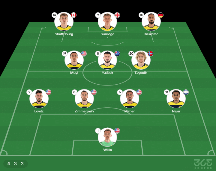 - Escalação do Nashville: Willis, Lovitz, Zimmerman, Maher e Najar; Muyl, Yazbek e Tagseth; Shaffelburg, Mukhtar e Surridge