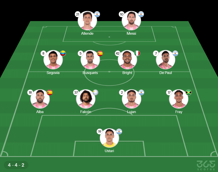 - Provável escalação do Inter Miami: Ustari, Jordi Alba, Lujan, Falcón e Fray; Segovia, Sergio Busquets, Bright e Rodrigo De Paul; Allende e Lionel Messi