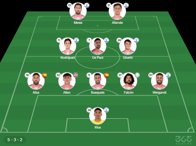 - Provável escalação do Inter Miami: Ríos; Weigandt, Falcón, Busquets, Allen e Jordi Alba; Silvetti, De Paul, Rodríguez; Allende e Messi
