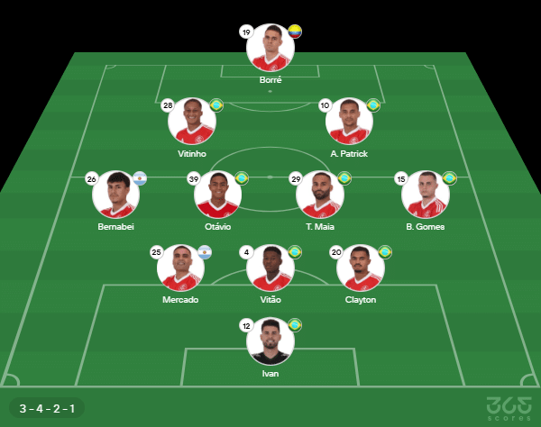 - Provável escalação do Internacional: Ivan; Clayton, Vitão, Mercado; Bruno Gomes, Thiago Maia, Luis Otávio, Bernabei; Alan Patrick, Vitinho e Borré.