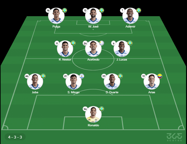 - Provável escalação do Bahia: Ronaldo; Arias, David. Duarte, Mingo e Luciano Juba; Jean Lucas, Acevedo e Rodrigo Nestor; Ademir, Pulga, William José.