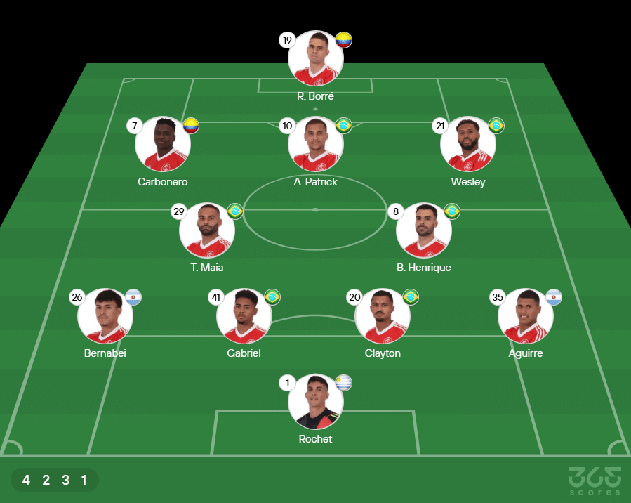 - Provável escalação do Internacional: Rochet, Bernabei, Victor Gabriel, Clayton e Aguirre; Thiago Maia, Bruno Henrique, Barbonero, Alan Patrick e Wesley; Rafael Borré