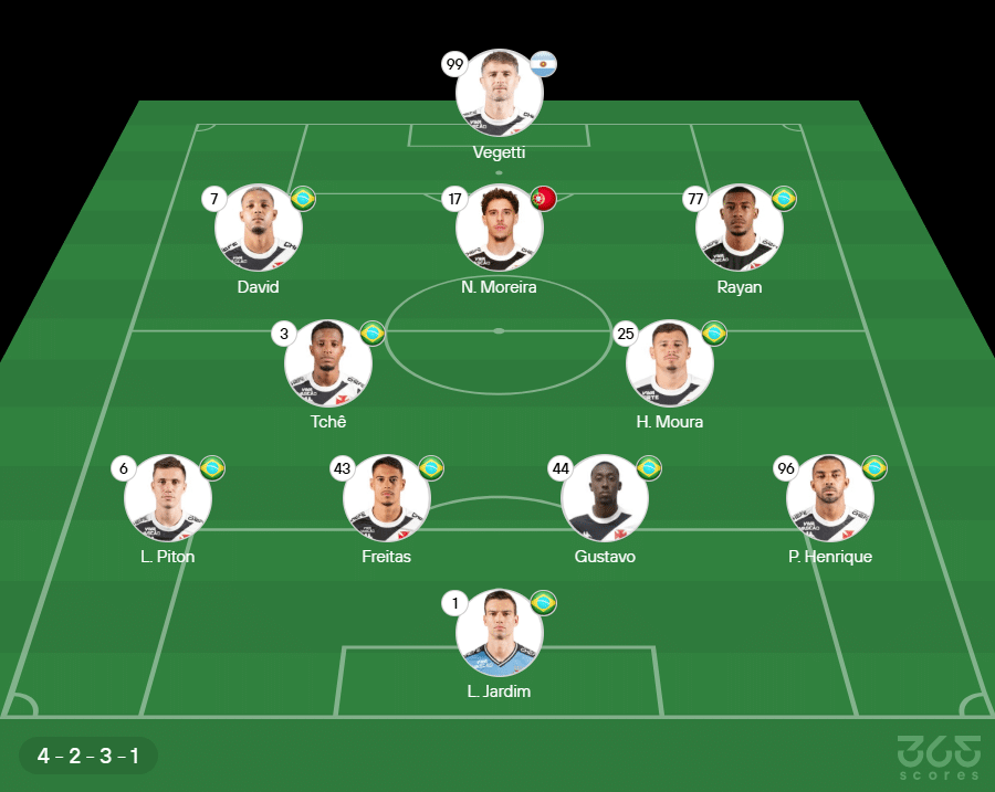 - Provável escalação do Vasco: Léo Jardim, Lucas Piton, Lucas Freitas, Luiz Gustavo e Paulo Henrique; Tchê Tchê, Hugo Moura, David, Nuno Moreira e Rayan; Pablo Vegetti
