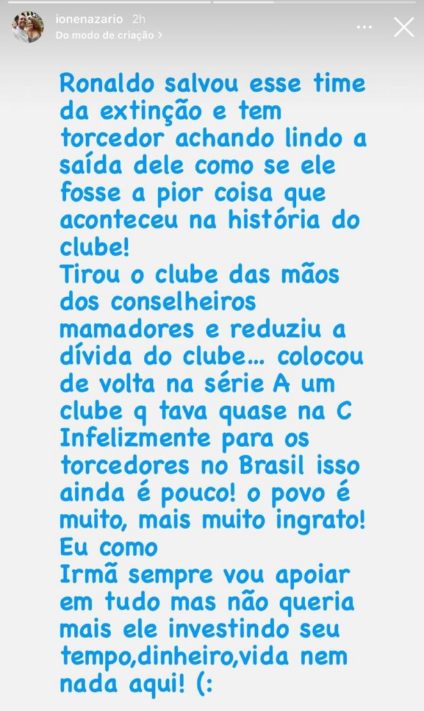 Na tarde desta segunda-feira (29), Ronaldo acertou a venda de 90% Sociedade Anônima do Futebol (SAF) para o empresário Pedro Lourenço. Em suas redes sociais, a irmã do Fenômeno, Ione Nazário, detonou a torcida do clube pela “ingratidão”.