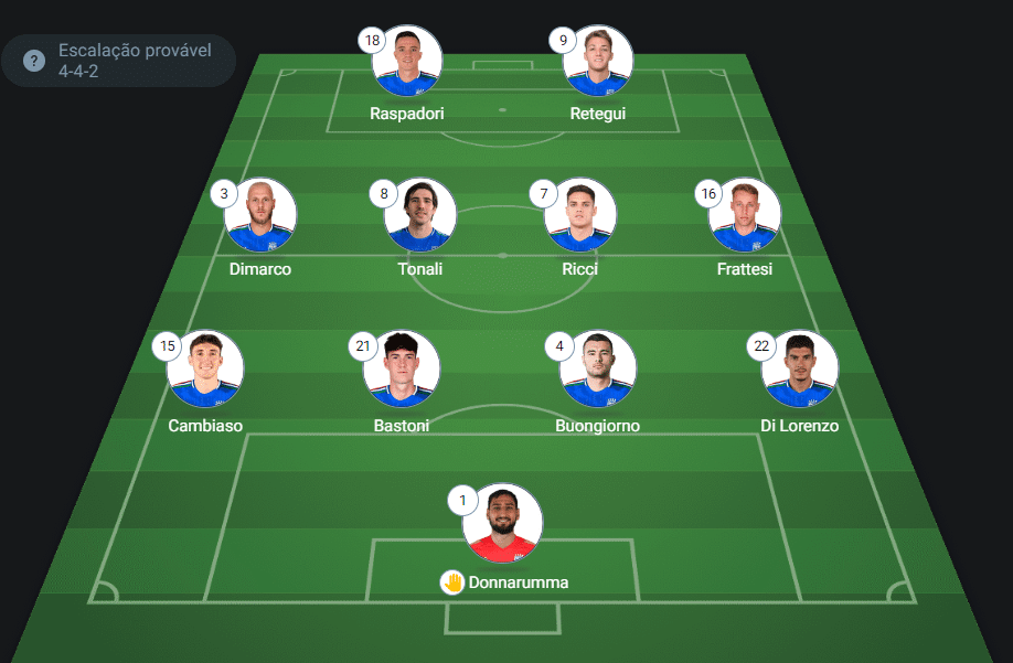 - Provável escalação da Itália: Donnarumma, Cambiasso, Bastoni, Buongiorno e Di Lorenzo; Dimarco, Tonali, Ricci e Frattesi; Raspadori e Retegui