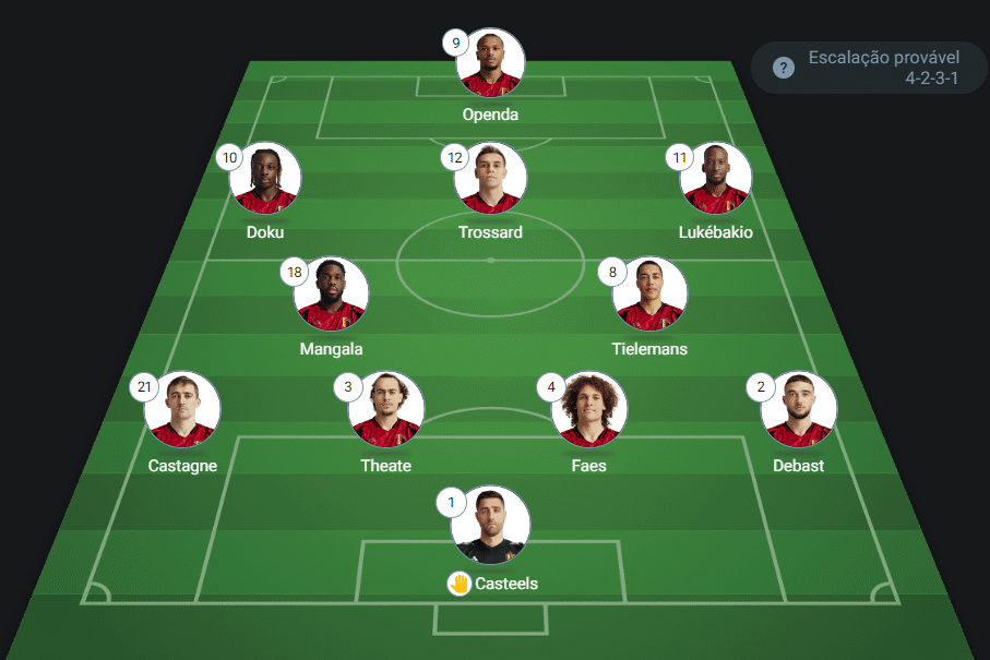 - Provável escalação da Bélgica: Casteels, Castagne, Theate, Faes e Debast; Mangala, Tielemans, Doku, Trossard e Lukebakio; Openda
