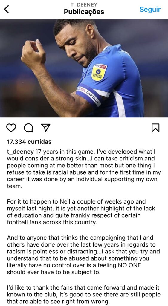 “Eu aceito críticas e xingamentos melhor que a maioria, mas uma coisa que me recuso a aceitar é abuso racial, e pela primeira vez em minha carreira foi feito por um indivíduo do meu próprio clube”, escreveu em um trecho da mensagem no Instagram.