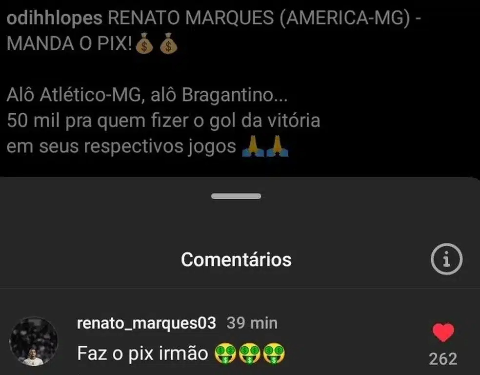 Ao término da partida, Renato fez questão de cobrar o comediante, que tinha prometido o valor caso alguém conseguisse ajudar o Santos na reta final do Brasileirão. “Faz o pix, irmão”, escreveu o atacante em rede social.