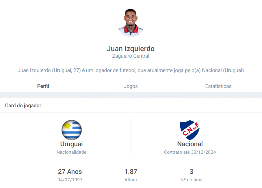 Juan Izquierdo é um zagueiro de 27 anos que chegou ao Nacional em 2022. Além da equipe, ele acumula passagens por Liverpool-URU, Wanderers-URU, Atlético San Luis-MEX, Peñarol-URU e Cerro-URU.