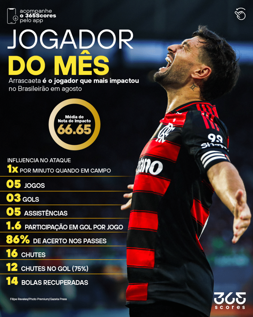 Arrascaeta segue brilhando pelo Flamengo no Campeonato Brasileiro. Com três gols e cinco assistências nas cinco partidas do Rubro-negro na competição em agosto, ele foi eleito o Jogador do Mês 365Scores do Brasileirão.
