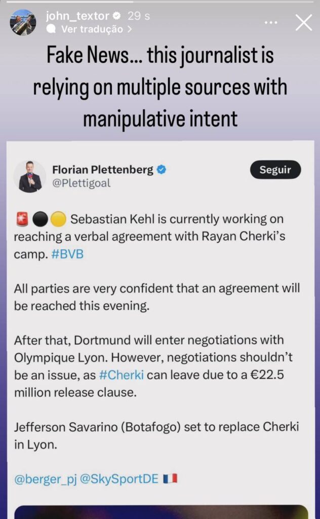 O jornalista Florian Plattenberg postou em sua conta do X que o Borussia Dortmund iria abrir negociações com o Lyon por Rayan Cherki e que com isso o clube francês iria contratar Savarino como reposição.