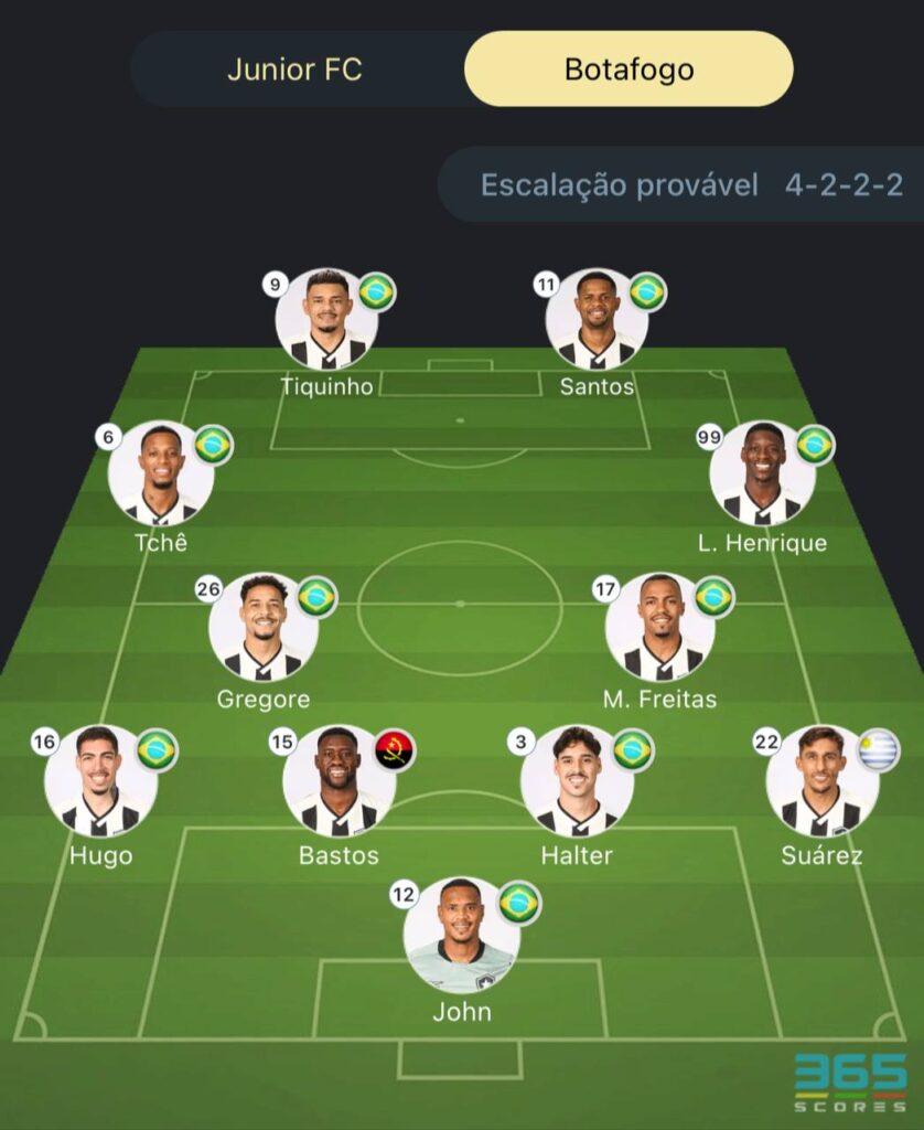 - Escalação Provável do Botafogo: John, Suárez, Halter, Bastos, Hugo; Marlon Freitas, Gregore, Luiz Henrique, Tchê Tchê; Junior Santos e Tiquinho Soares.
