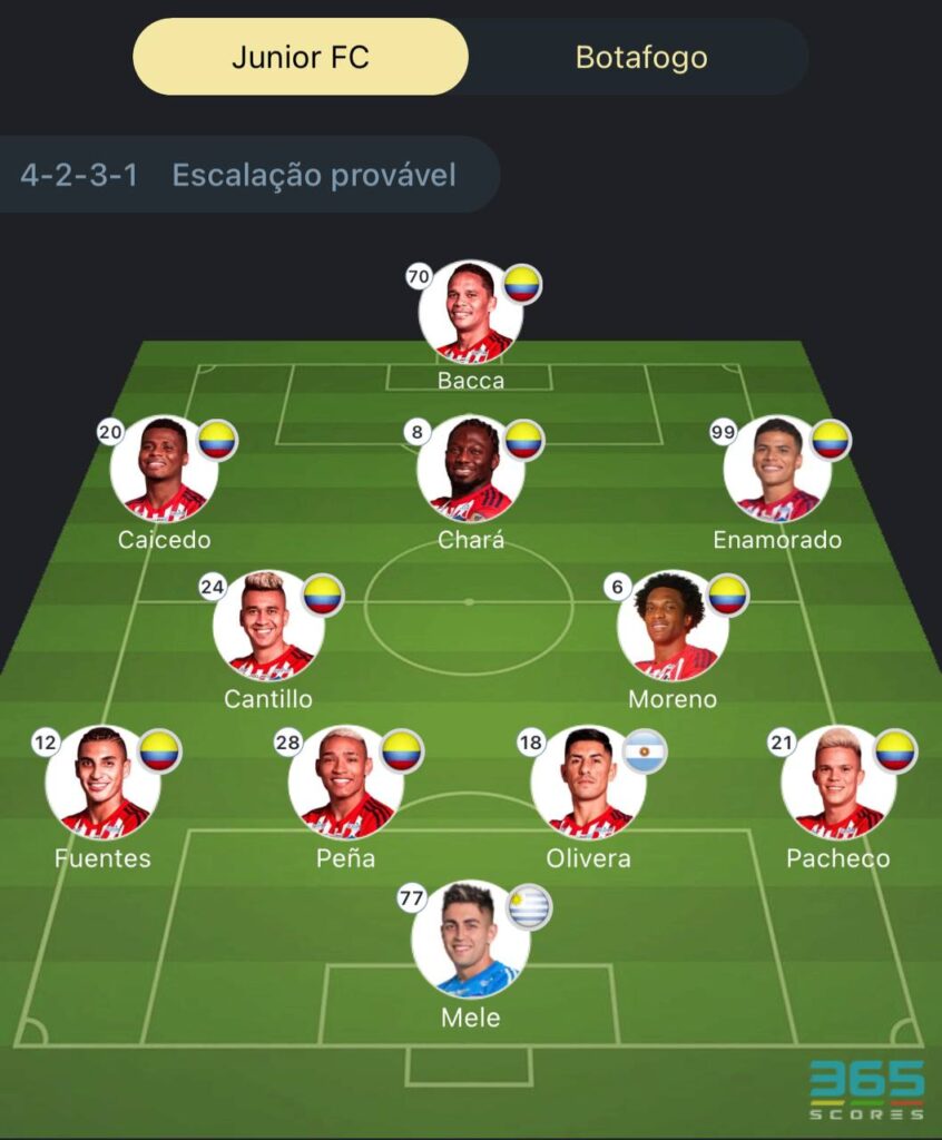 - Escalação Provável do Junior Barranquilla: Mele, Pacheco, Olivera, Peña, Fuentes; Moreno, Catillo, Enamorado, Chará, Caicedo; Bacca