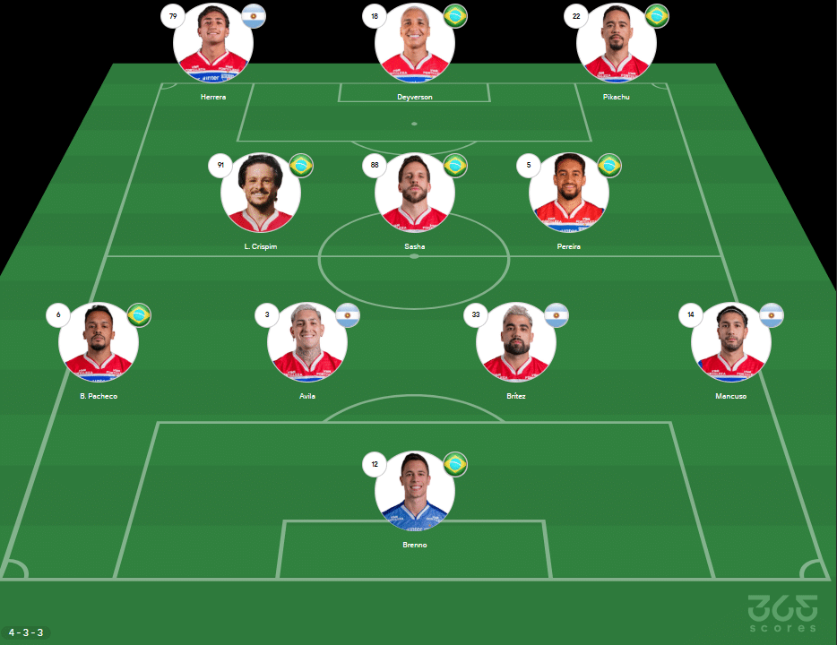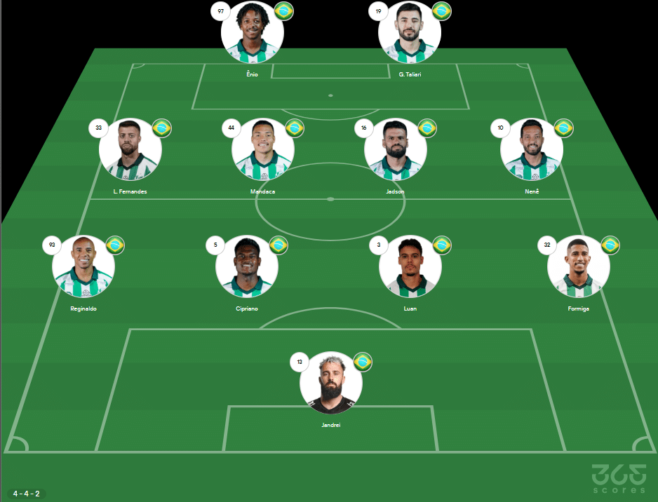 - Provável escalação do Fortaleza: Brenno; Bruno Pacheco, Avila, Brítez e Mancuso; Lucas Crispim, Lucas Sasha e Matheus Pereira; Herrera, Deyverson e Yago Pikachu