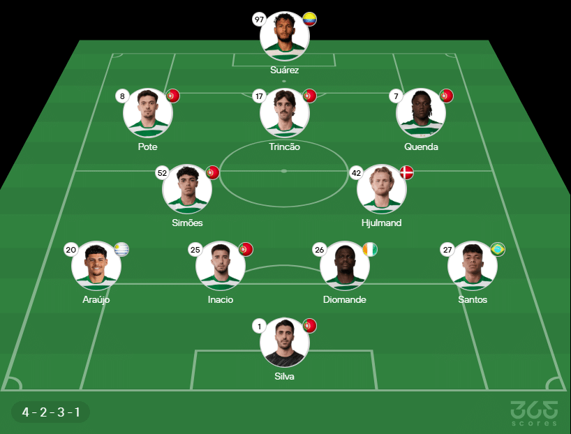- Provável escalação do Sporting: Rui Silva; Alisson Santos, Diomande, Inacio e Araújo; Hjulmand e Simões; Quenda, Trincão e Pote; Luis Suárez