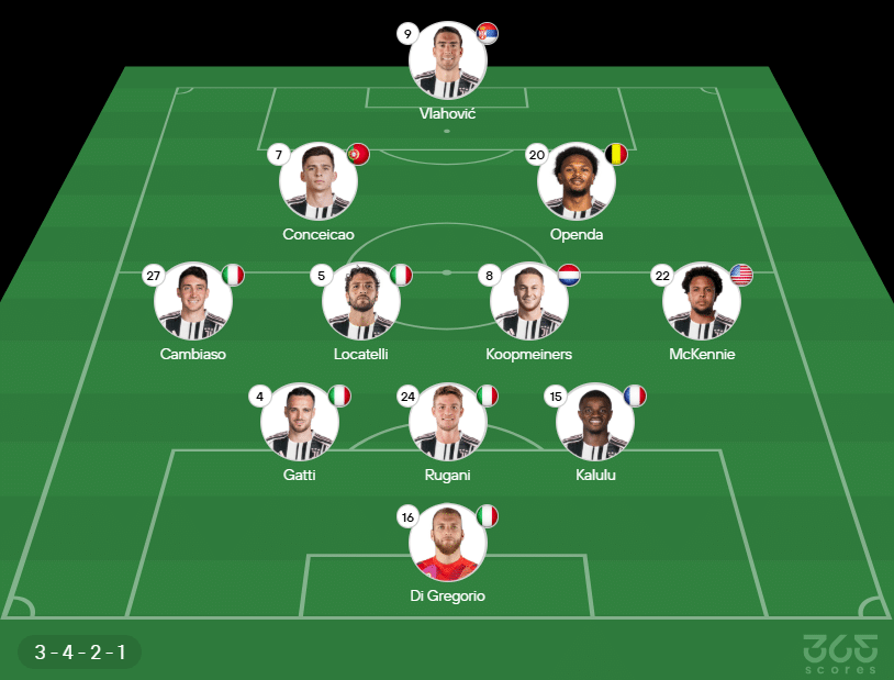- Provável escalação da Juventus: Di Gregorio; Gatti, Rugani e Kalulu; McKennie, Koopmeiners, Locatelli e Cambiaso; Openda e Francisco Conceição; Vlahovic