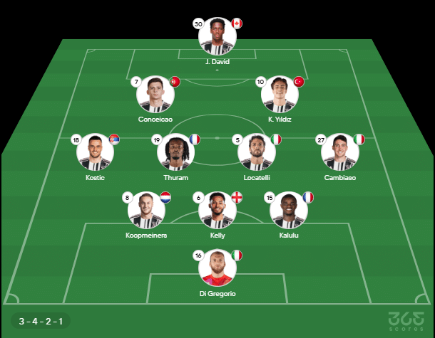 - Provável escalação da Juventus: Di Gregorio; Kalulu, Kelly, Koopminers; Cambiaso, Locatelli, Thuram, Kostic; Yildiz, Conceição, J. David
