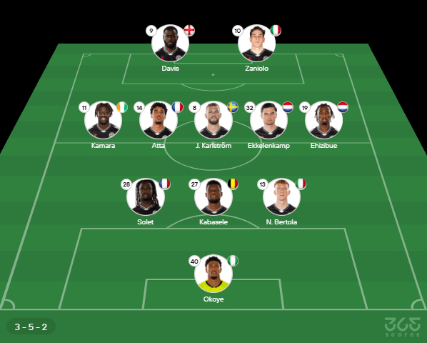 - Provável escalação da Udinese: Okoye; Bertola, Kabasele, Solet; Ehizibue, Ekkelenkamp, Karlstrom, Atta, Kamara; Zaniolo, Davis