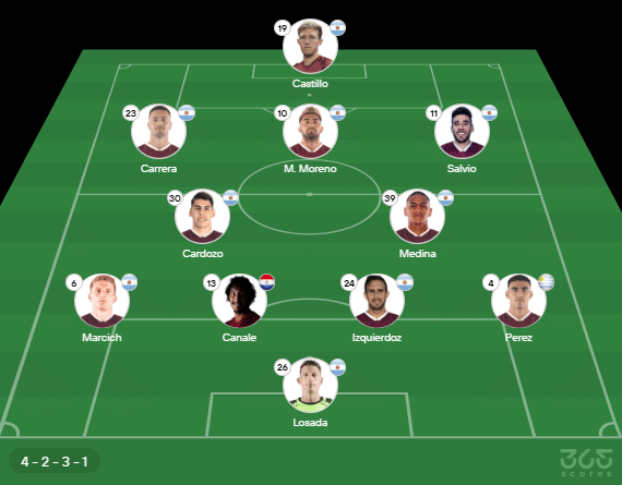 - Provável escalação do Lanús: Losada; Marcich, Canale, Izquierdoz e Perez; Cardoso, Medina, Carrera, Marcelino Moreno e Salvio; Castillo