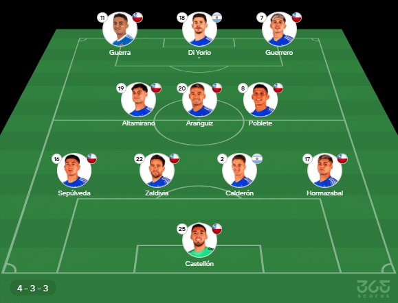 - Provável escalação da Universidad de Chile: Castellón; Sepúlveda, Zaldivia, Calderón e Hormazabal; Altamirano, Aranguiz e Poblete; Guerra, Di Yorio e Guerrero