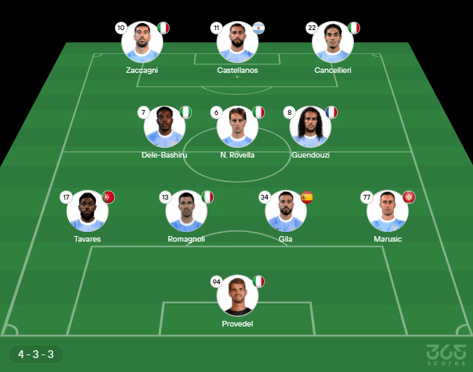 Provável escalação da Lazio: Provedei; Nuno Tavares, Romagnoli, Gila e Marusic; Dele-Bashiru, Rovella e Guendouzi; Zaccagni, Taty Castellanos e Cancelleri. Técnico: Maurizio Sarri.