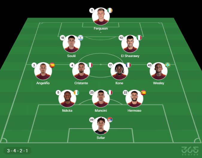Provável escalação da Roma: Svilar; Ndicka, Mancini e Hermoso; Angeliño, Cristante, Kone e Wesley; Soulé e El Shaarawy; Ferguson. Técnico: Gian Piero Gasperini.
