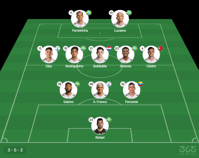 Provável escalação do São Paulo: Rafael. Sabino, Alan Franco e Ferraresi; Enzo Díaz, Rodriguinho, Bobadilla, Marcos Antônio e Cedric; Ferreira e Luciano. Técnico: Hernán Crespo.