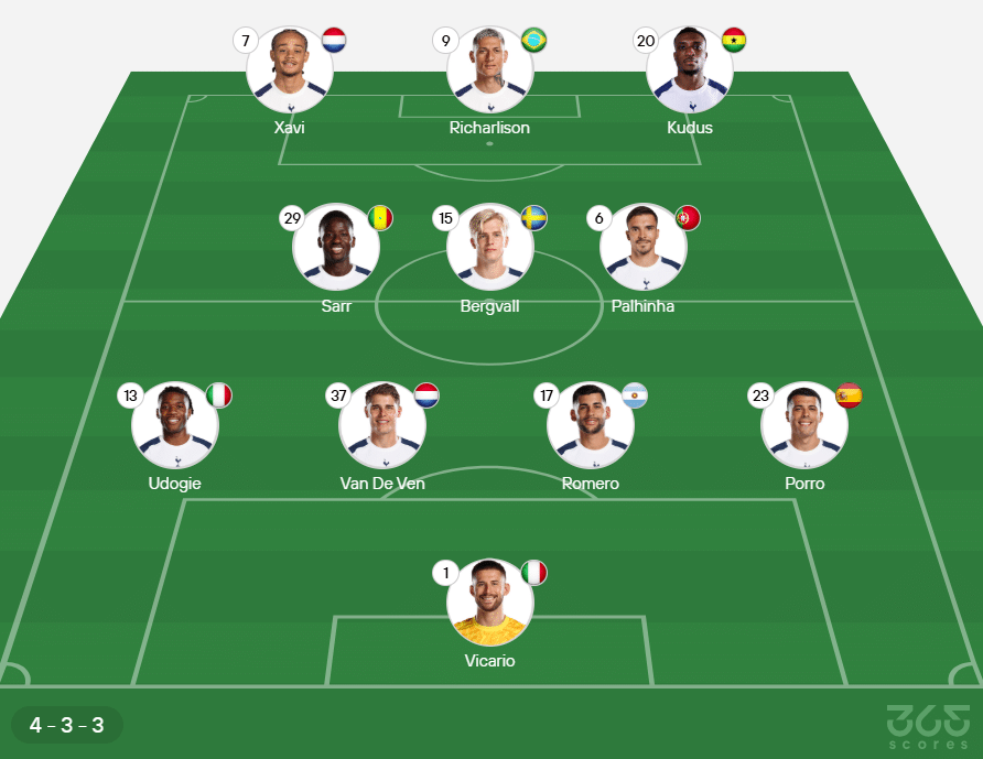 Provável escalação do Tottenham: Vicario; Djed Spence, Romero, Van de Ven e Udogie; Pape Sarr, João Palhinha e Bergvall; Xavi Simons, Kudus e Richarlison.