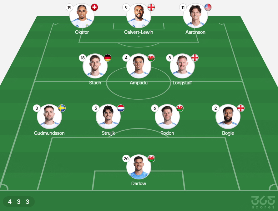 Provável escalação do Leeds United: Darlow; Bogle, Rodon, Strujik e Gudmundsson; Stach, Ampadu e Longstaff; Okafor, Aaronson e Calvert-Lewin.