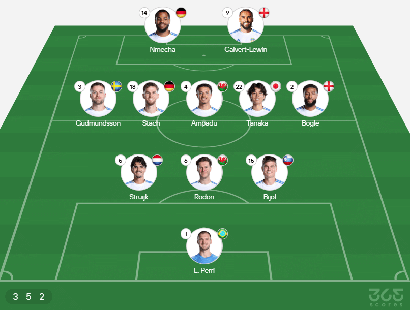 Escalação do Leeds: Lucas Perri; Bikol, Rodon e Strujik; Bogle, Tanaka, Ampadu, Stach e Gudmundsson; Nmecha e Calvert-Lewin.