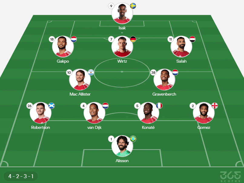 Escalação do Liverpool: Alisson; Joe Gomez, Konate, Virgil van Dijk e Robertson; Gravenberch e Mac Allister; Gakpo, Wirtz e Salah; Isak.