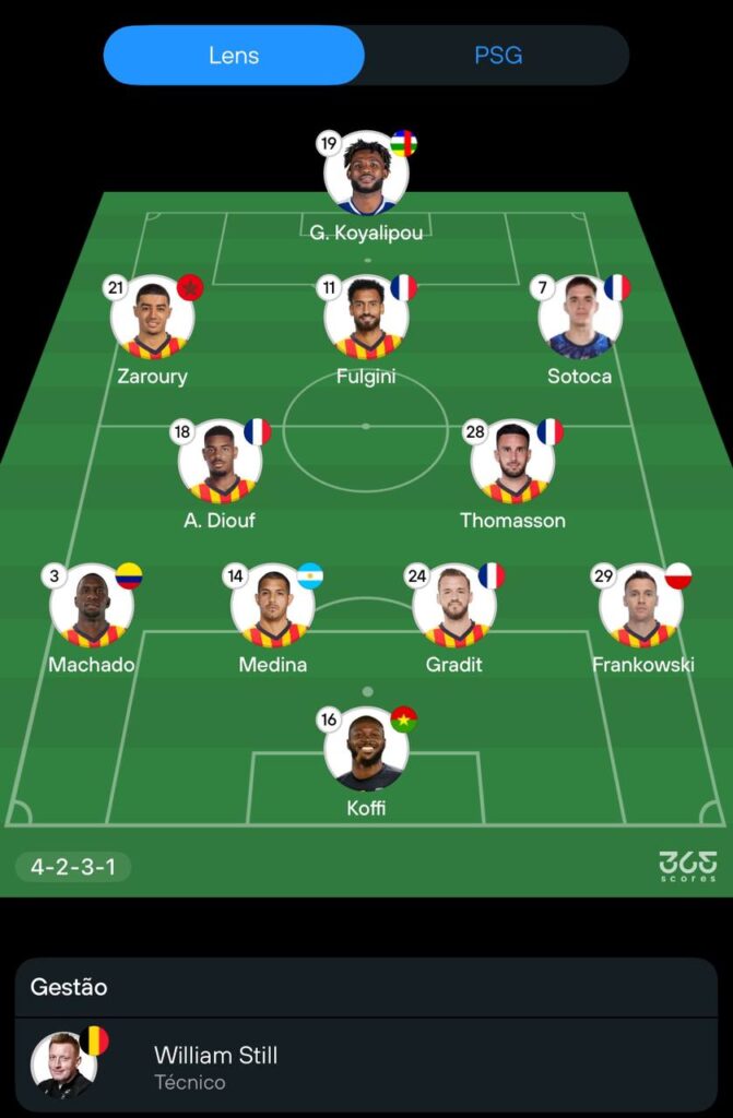- Provável escalação do Lens: Koffi; Frankowski, Gradit, Medina e Machado; Thomasson, Diouf, Sotoca, Fulgini e Zaroury. Koyalipou.