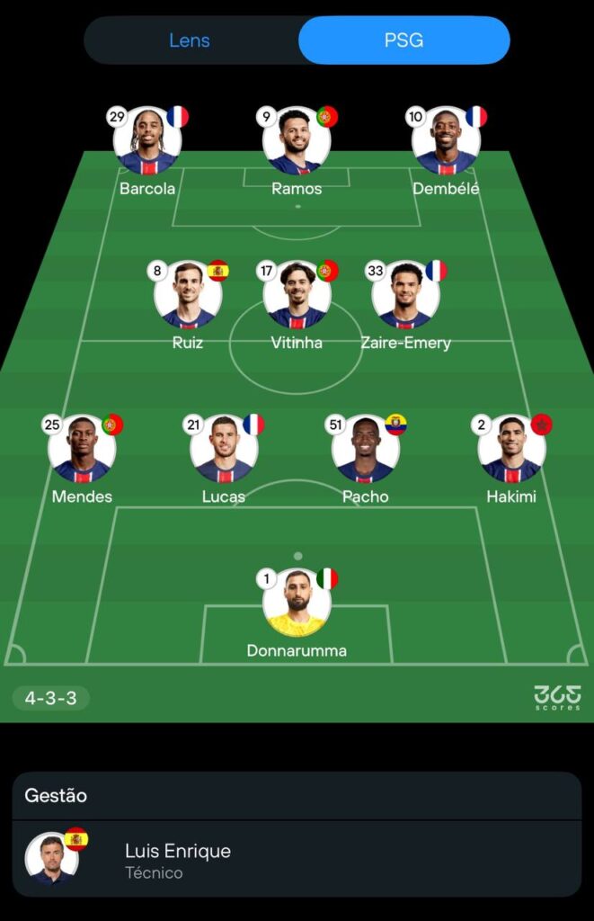 - Provável escalação do PSG: Donnarumma; Hakimi, Pacho, Lucas e Mendes; Zaire-Emery; Vitinha e Ruiz; Dembélé, Ramos e Barcola.