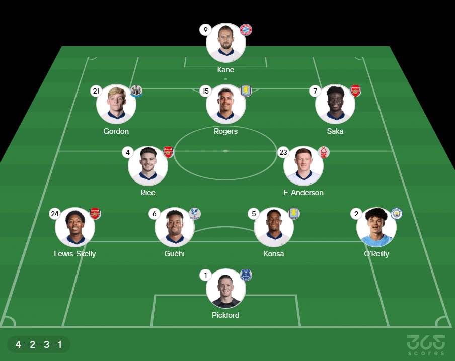 Provável escalação da Inglaterra: Pickford, Lewis-Skelly, Guéhi, Konsa e O’Reilly; Declan Rice, Elliott Anderson, Gordon, Rogers e Saka; Harry Kane. Técnico: Thomas Tuchel.