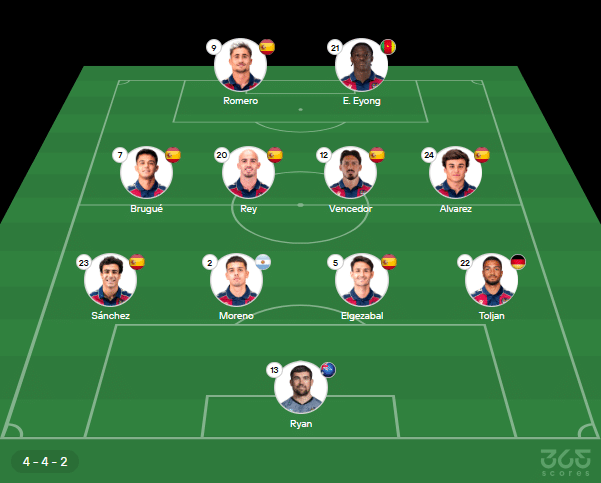 Provável escalação do Levante: Ryan; Toljan, Elgezabal, Morene, Sánchez; Alvarez, Vencedor, Rey, Brugué; E. Eyong e Romero. Técnico: Julián Calero