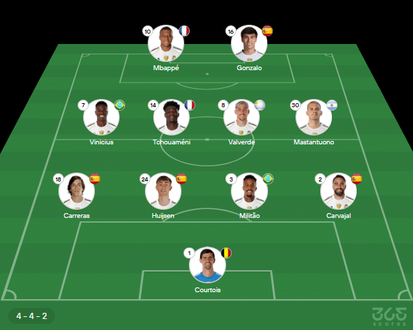 - Provável escalação do Real Madrid: Courtois; Carvajal, Militão, Huijaen, Carreras; Mastantuno, Valverde, Tchouaméni, Vini Jr.; Gonzalo e Mbappé