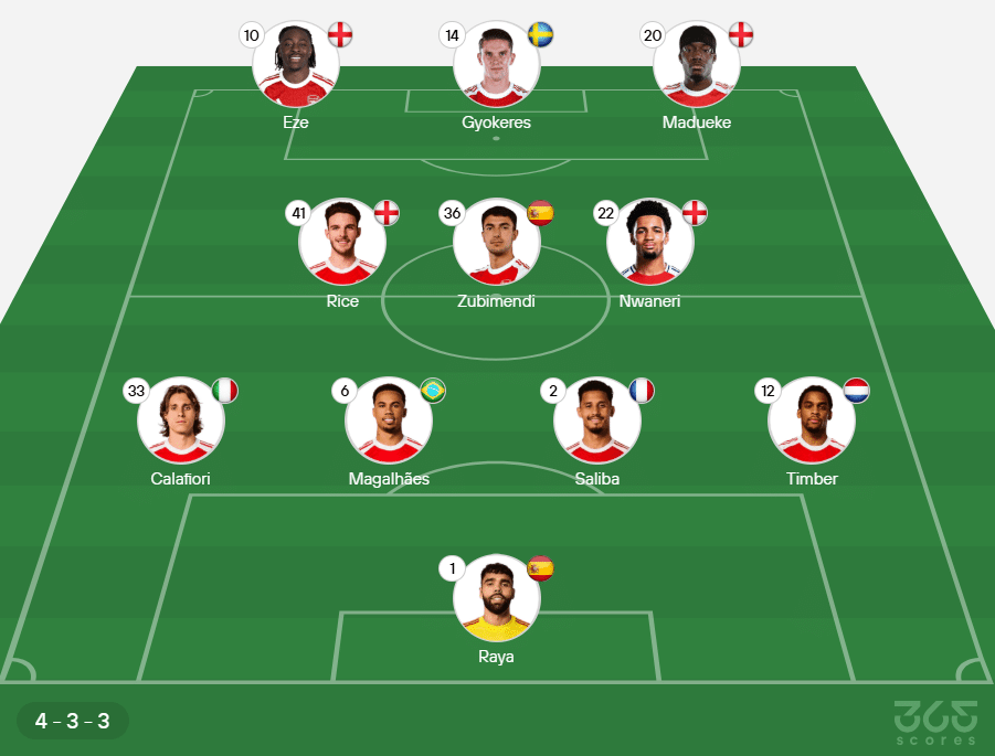 Provável escalação do Arsenal: Raya; Timber, Saliba, Gabriel Magalhães e Calafiori; Zubimendi, Nwaneri e Declan Rice; Madueke, Eze e Gyokeres.