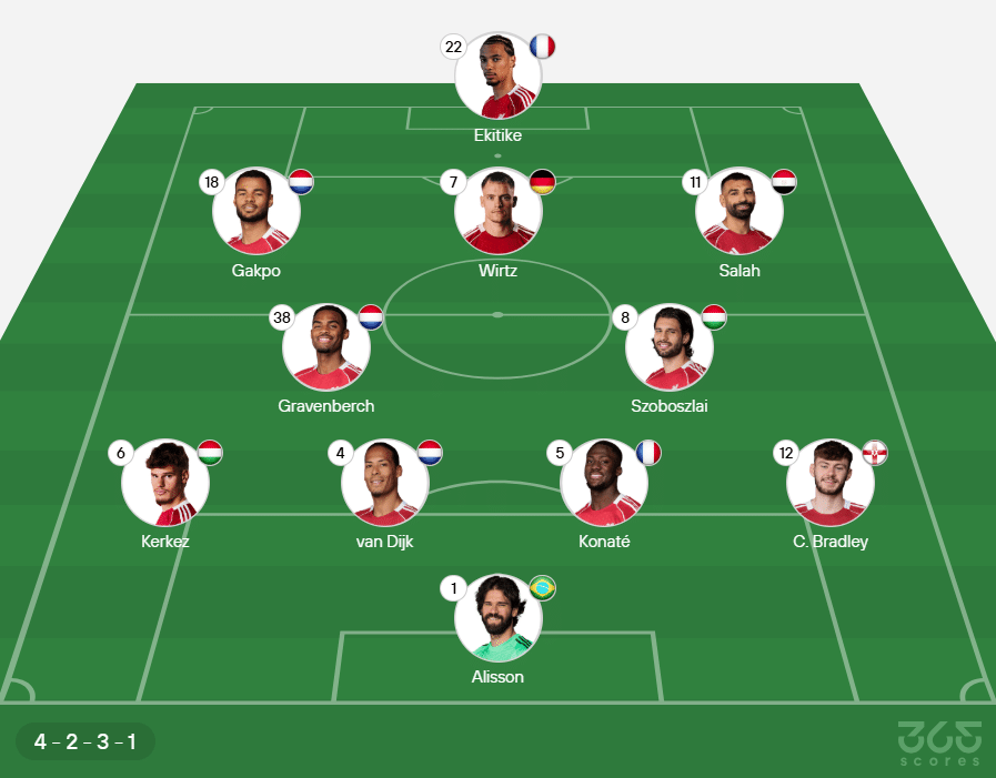 - Provável escalação do Liverpool: Alisson; Bradley, Konate, Virgil van Dijk e Kerkez; Gravenberch e Szoboszlai; Wirtz, Gakpo e Salah.